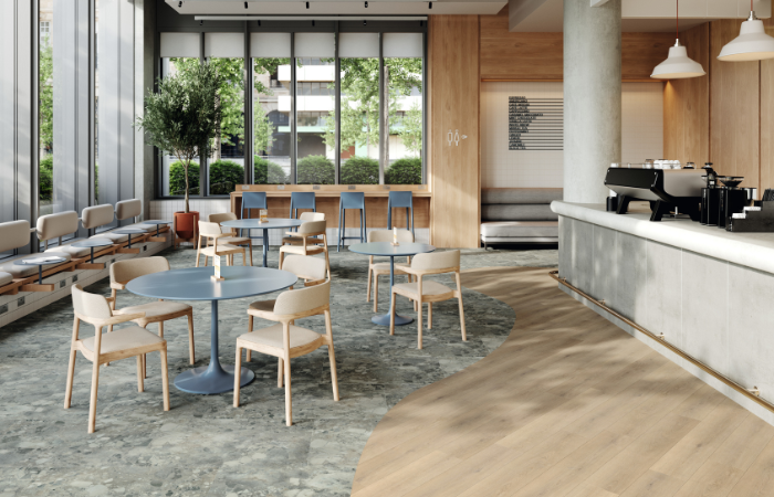 Spacia Stones bring together timeless natural references with contemporary direction. Classic stones and softly textured finishes provide familiar, versatile foundations, while embedded concrete designs and a refreshed terrazzo offering create opportunities for zoning and visual interest in larger commercial spaces. The updated collection also reintroduces classic marble tones, offering a familiar black-and-white aesthetic without moving into higher design tiers
